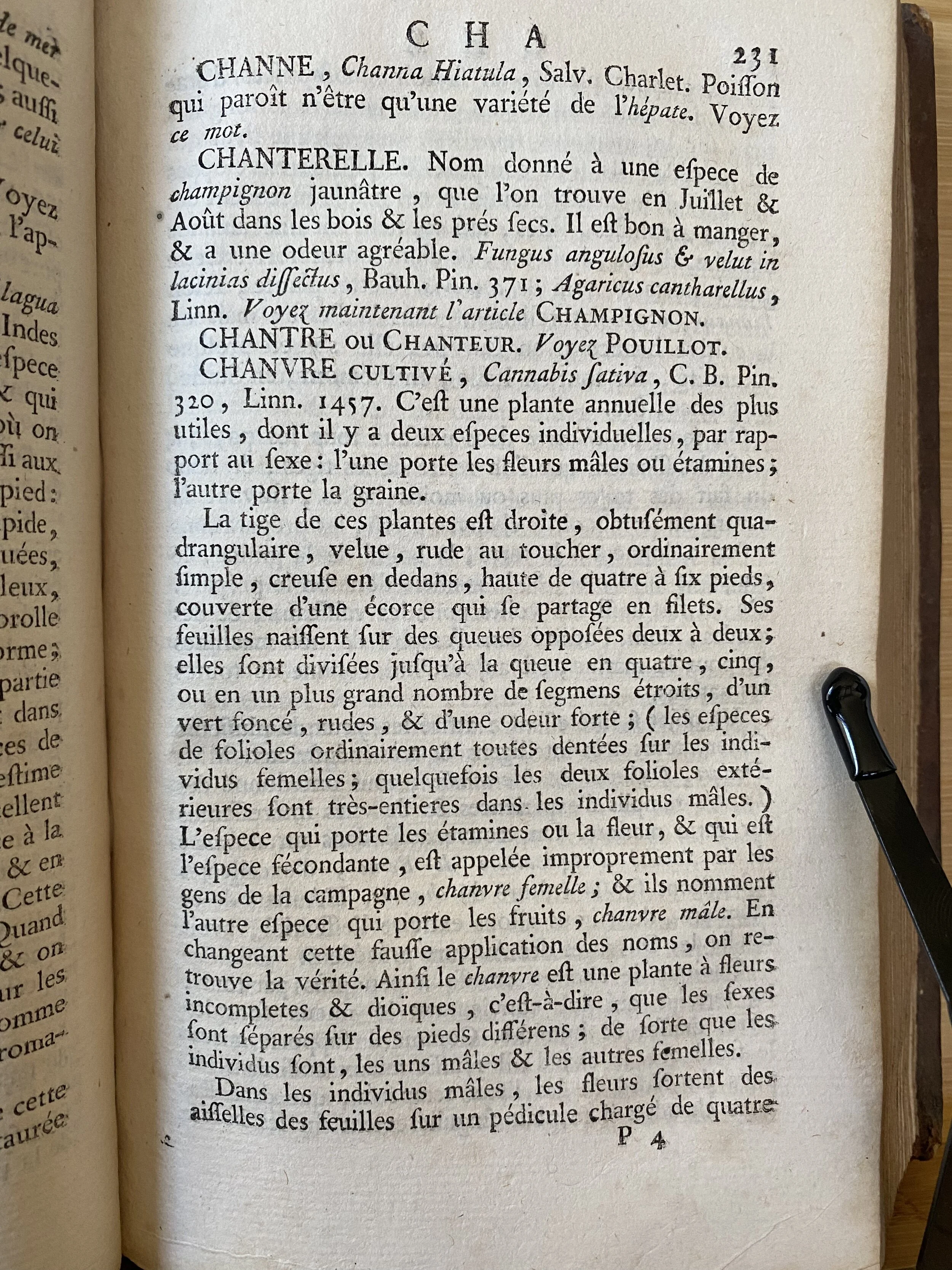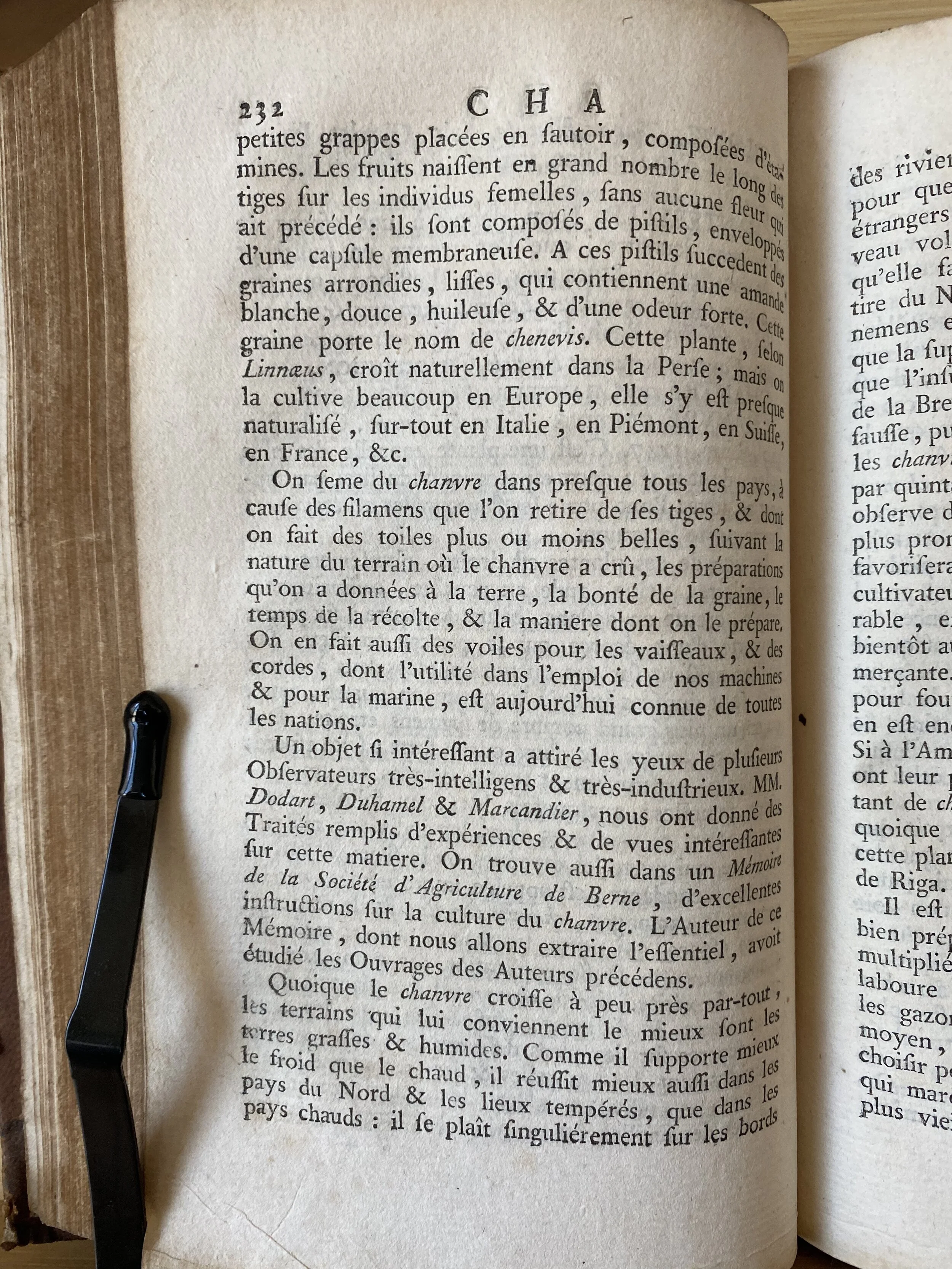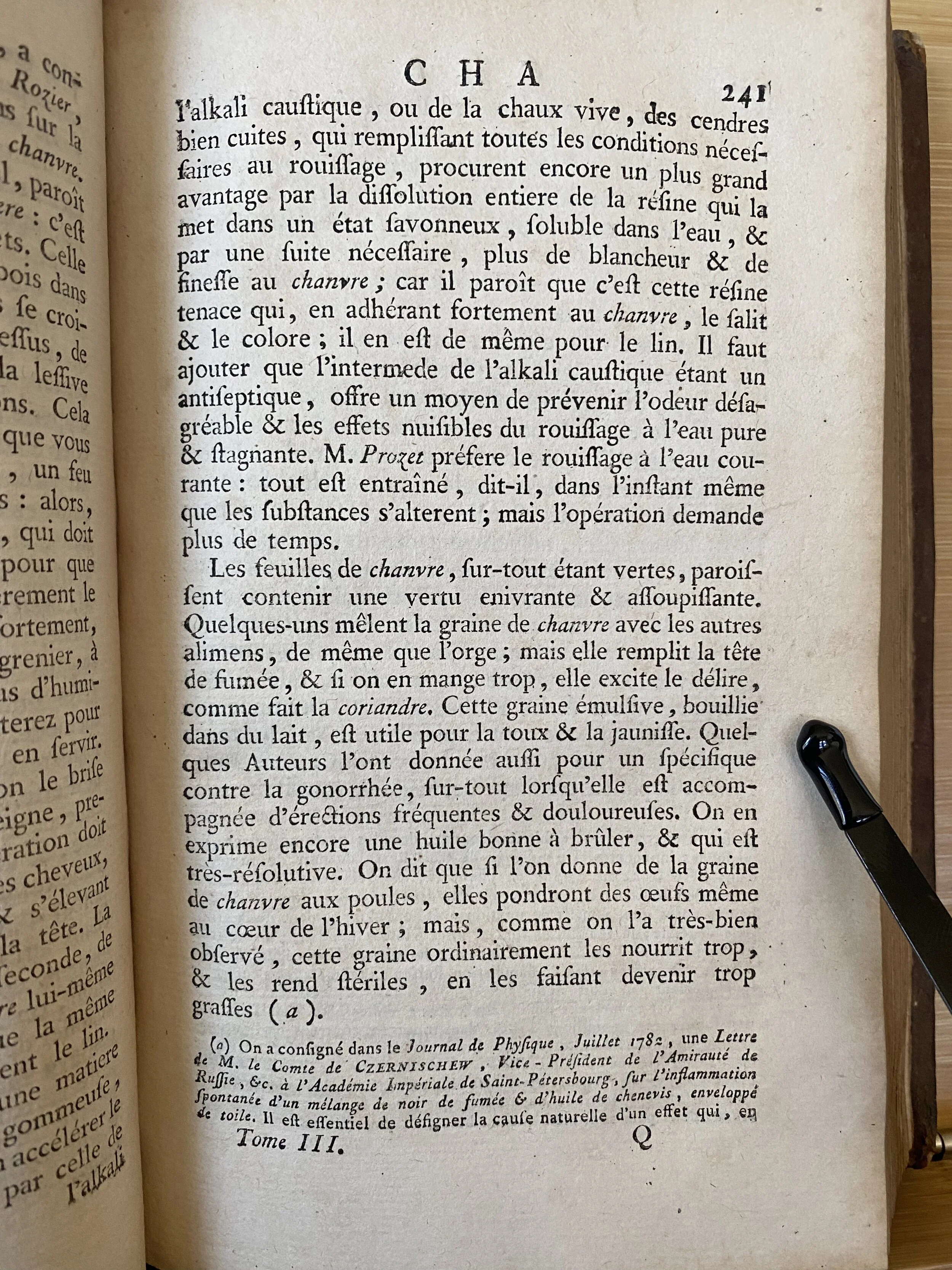 This is an article about hemp from the 3rd volume (of 15) of the “Dictionnaire Raisonné Universel D'Histoire Naturelle, contenant l'histoire des Animaux, des Végétaux, et des Minéraux et celle des Corps célestes, des Météores, et des autres principaux phénomènes de la Nature” or “Universal Dictionary of Natural History, containing the history of animals, plants, minerals, celestial bodies, meteorites and other principal natural phenomena” published in 1791.