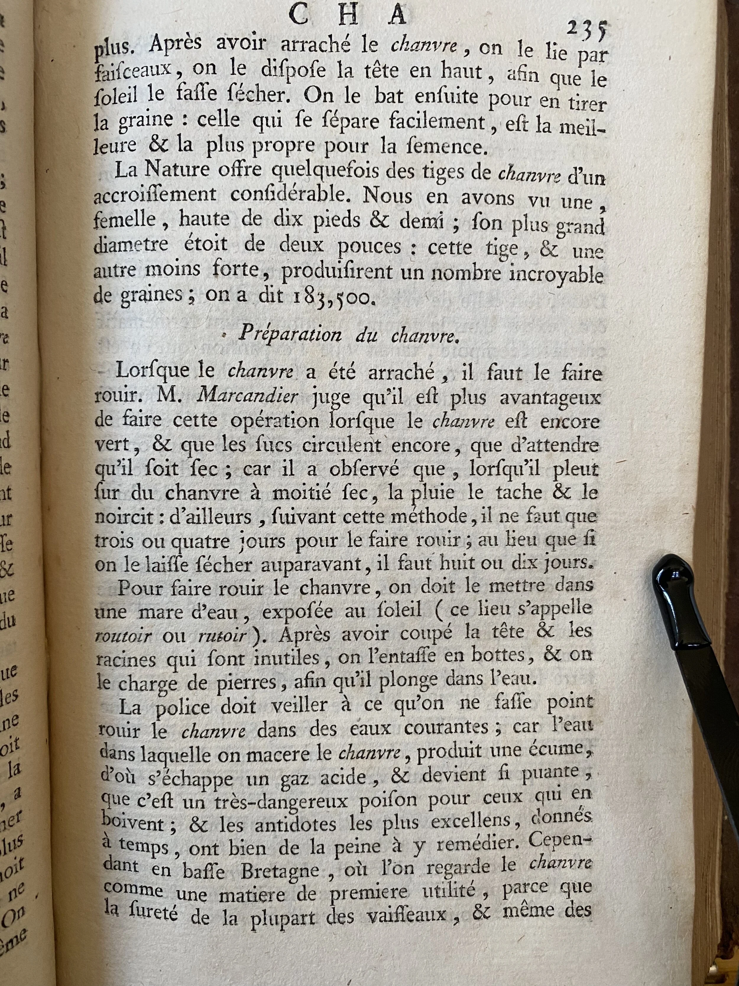 The police must ensure that the hemp is not retted in running water, because the water in which the hemp is steeped produces a scum, from which escapes an acid gas, and becomes so stinking that it is a very dangerous poison for those who drink it, and even the most excellent antidotes, given in time, have great difficulty in remedying the them. Even in Lower Brittany, where hemp is regarded as an essential material, because the safety of most vessels and even boats which are used as ferries, depends on its good quality, we do not to ret the hemp in running water, which drives out all the fish, and especially the salmon.