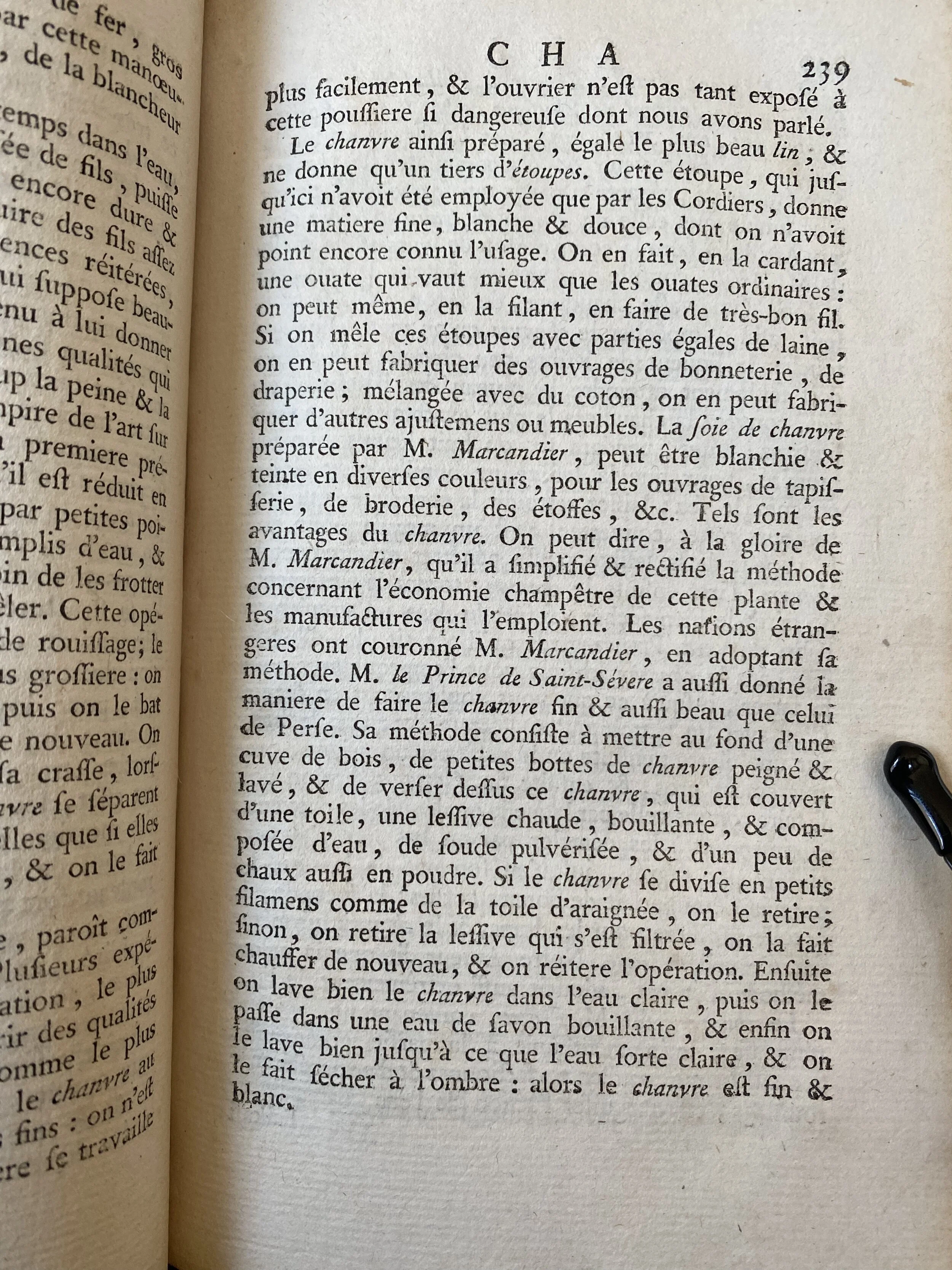 Le chanvre ainsi prépare, égale le plus beau lin, & ne donne qu’un tiers, d’étoupes. Cette étoupe, qui jusqu’ici n’avoit été employée que par les Cordiers, donne une matiere fine, blanche & douce, dont on n’avoit point encore connu l’usage. On en fait, en la cardant, une ouate qui vaut mieux que les ouates ordinaires : on peut même, en la filant, en faire de très-bon fil. Si on mêle ces étoupes avec parties égales de laine, on en peut fabriquer des ouvrages de bonneterie, de draperie ; mélangée avec du coton, on en peut fabriquer d’autres ajustemens ou meubles. La soie de chanvre préparée par M. Marcandier, peut être blanchie & teinte en diverses couleurs, pour les ouvrages de tapisserie, de broderie, des étoffes, &c. Tels sont les avantages du chanvre. On peut dire, à la gloire de M. Marcandier, qu’il a simplifie & rectifié la méthode concernant l’économie champêtre de cette plante & les manufactures qui l’emploient. Les nations étrangeres ont couronné M. Marcandier, en adoptant sa méthode. M. le Prince de Saint-Sévere a aussi donné la maniere de faire le chanvre fin & aussi beau que celui de Perse. Sa méthode consiste à mettre au fond d’une cuve de bois, de petites bottes de chanvre peigné & lavé, & de verser dessus ce chanvre, qui est couvert d’une toile, une lessive chaude, bouillante, & composée d’eau, de soude pulvérisée, & d’un peu de chaux aussi en poudre. Si le chanvre se divise en petits filamens comme de la toile d’araignée, on le retire ; sinon, on retire la lessive qui s’est filtrée, on la fait chauffer de nouveau, & on réitere l’opération. Ensuite on lave bien le chanvre dans l’eau claire, puis on le passe dans une eau de savon bouillante, & enfin on le lave bien jusqu’à ce que l’eau sorte claire, & on le fait secher à l’ombre : alors le chanvre est fin & blanc.